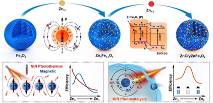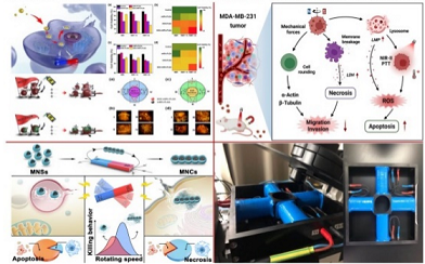 围绕过渡金属掺杂纳米探针材料体系,成功制备了新型单组分掺杂系列ZnxFe3-xO4多功能纳米探针材料。在赋予其光、磁、电多场耦合响应功能的同时,通过调节其粒径大小与不同锌掺杂量,集成调控其磁共振、磁驱动、近红外光热、近红外光催化、光电响应性能,并阐明了该过渡金属掺杂型纳米探针材料的组分、结构和性能三者之间的动态变化过程与内在联系。选择磁响应能力最强的Zn0.2Fe2.8O4纳米探针,利用自主搭建的磁场输出平台诱导纳米探针产生磁致机械运动,揭示其运动、形貌与机械力之间的相关性,实现磁致机械力大小可调、运动模式可调。通过精准操控磁致机械力作用,完成肿瘤化疗药物定时、定点释放,并结合机械力作用克服肿瘤耐药性,达到增强杀灭肿瘤的目的[1]。并且利用两种互补增强的非侵入性治疗方式实现了三阴性乳腺癌“二连击”协同治疗策略,显著降低了三阴性乳腺癌细胞的迁移和侵袭,增强了对其杀伤效果,并高效抑制了肿瘤复发[2]。此外,作者通过过渡金属离子掺杂改性金属配位化合物,如普鲁士蓝和姜黄素等纳米药物,利用离子干扰策略调控肿瘤细胞自身稳态、代谢、凋亡等生理活动途径,实现肿瘤的高效抑制[3]。